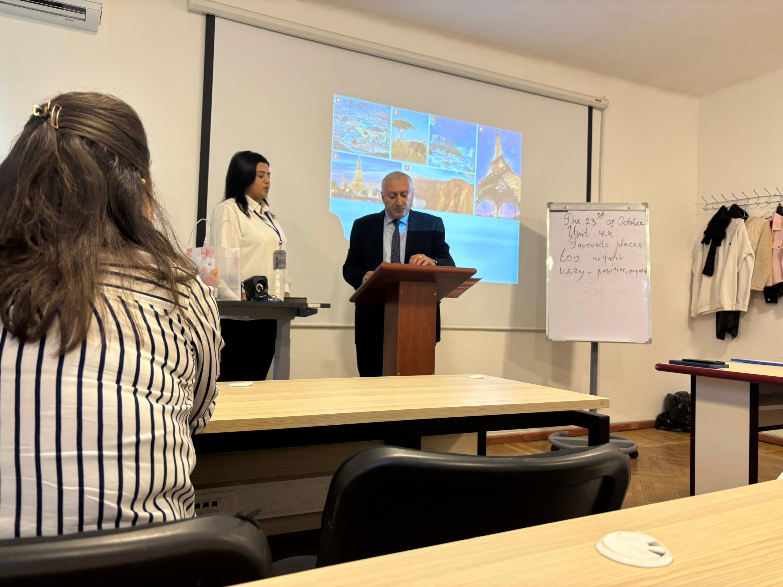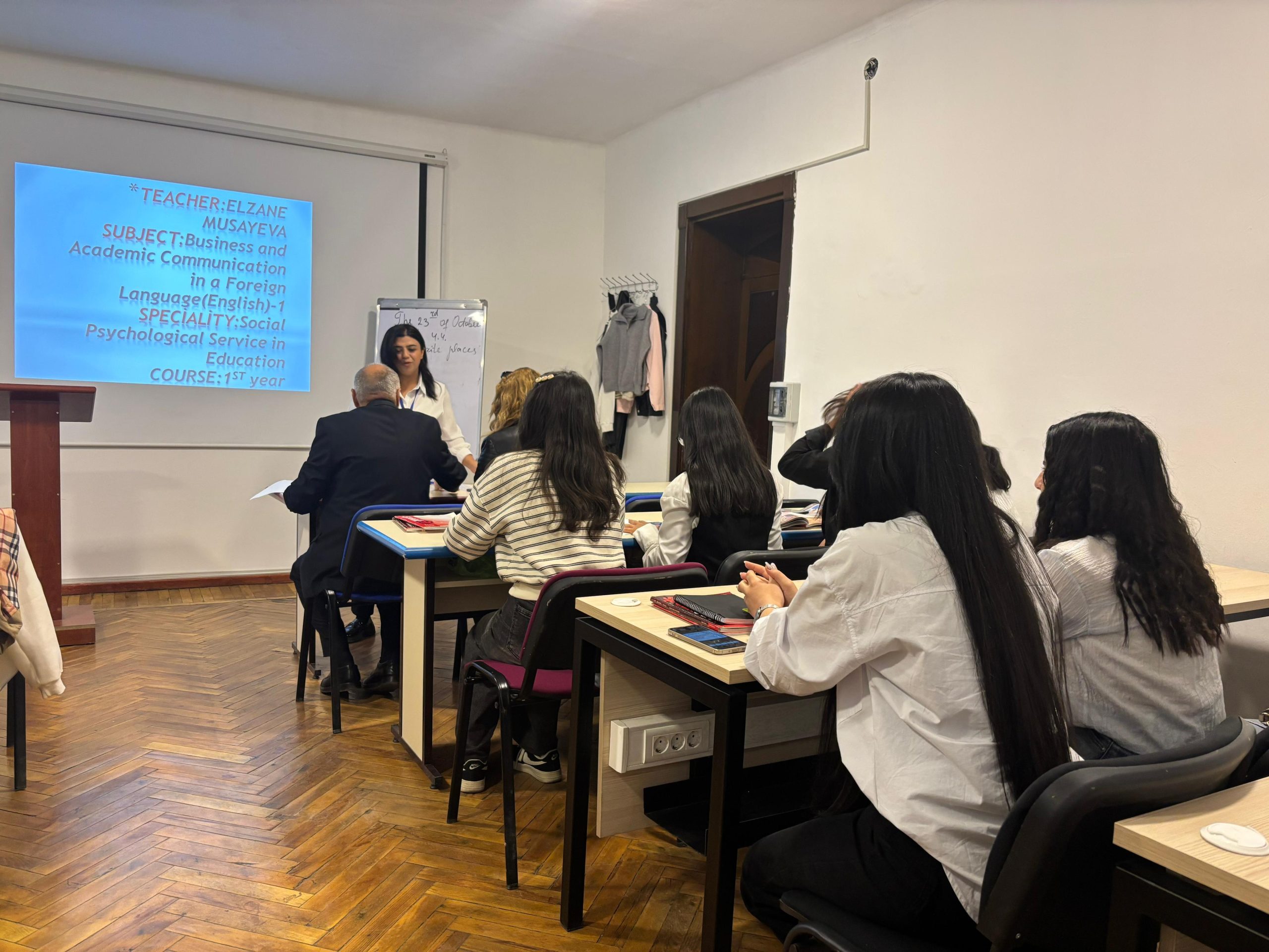 23 oktyabr 2025 ci ildə Praktiki Xarici dillər kafedrasının baş müəllimi Musayeva Elzanə Məmməd qızı Təhsildə Sosial Psixoloji Xidmət ixtisasının I kurs tələvbələri ilə Xarici dildə İşgüzar və Akademik Kommunikasiya (ingilis) fənnindən ““Can”-model feli, “Shopping”-(bazarlıq) mövzusu və Favourite places”-Sevimli yerlər” mövzusunda açıq dərs keçirilmişdir.