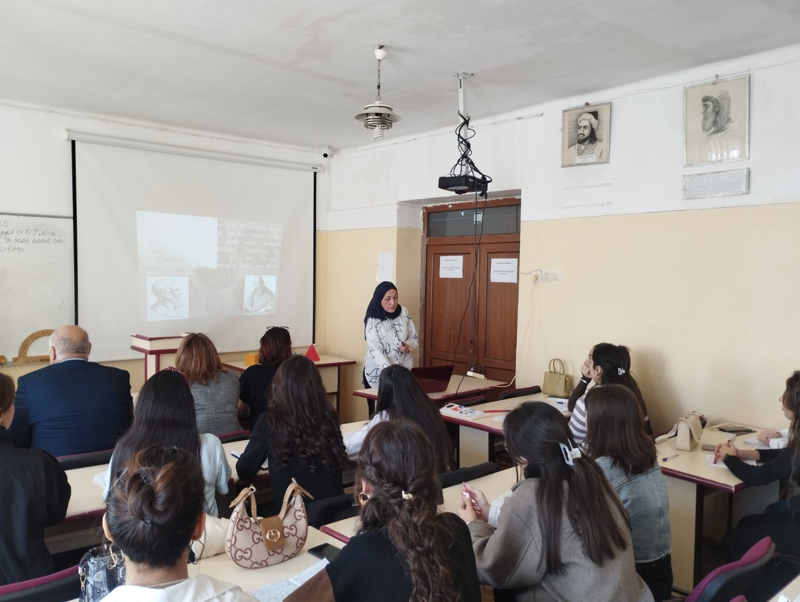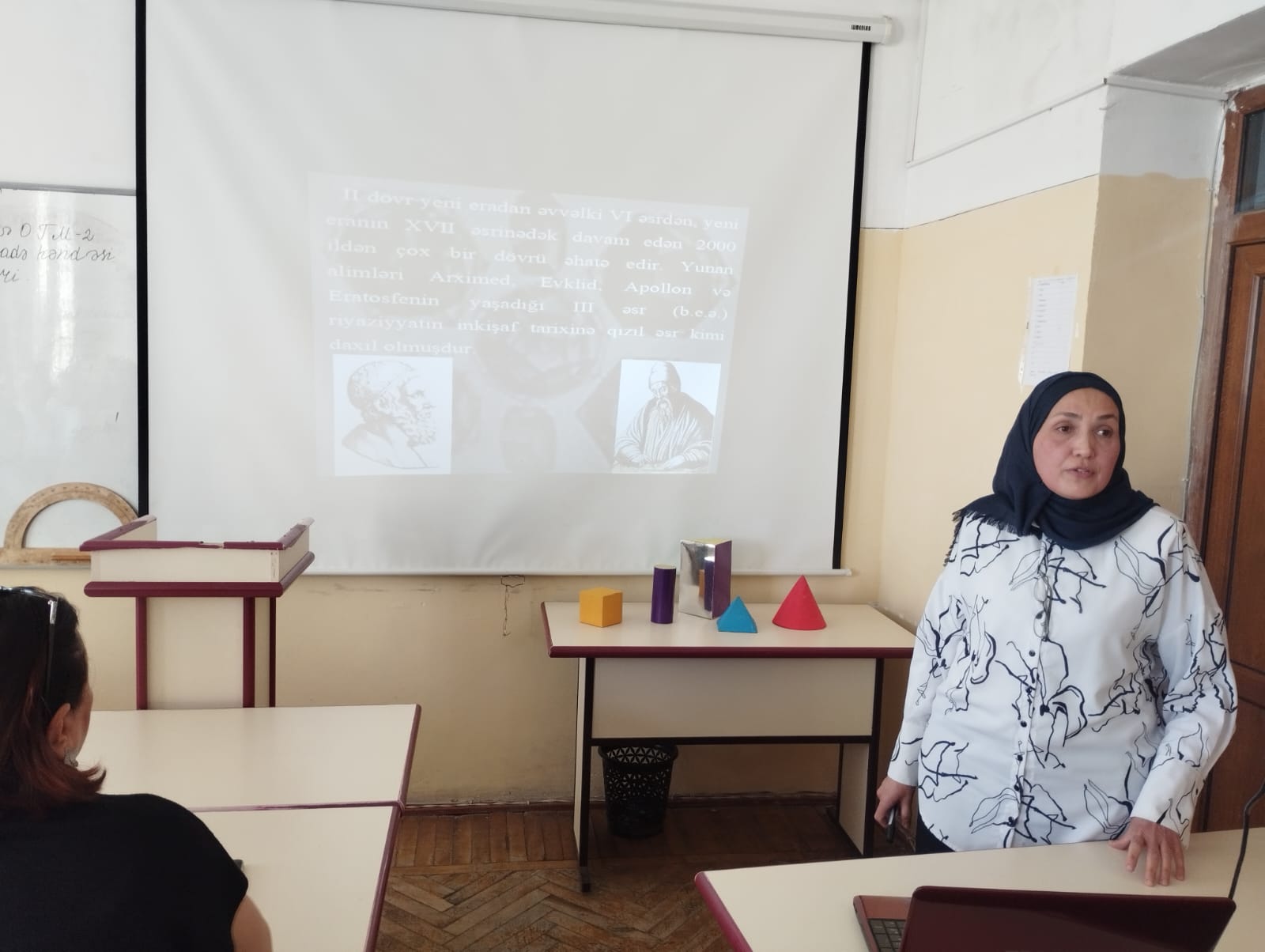 Ş.Binnətova dərsin planına uyğun olaraq tələbələrə həndəsənin inkişaf tarixi haqqında maraqlı məlumatlar verdi. Ən sadə fiqurlar və onların xassələrinə aid slaydlar nümayiş edərək, konkret misallarla mövzunu izah etdi. Dərs diskussiya formasında təşkil olunmuşdu.